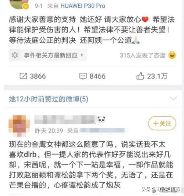 而对于投票结果不满意的,显然还不止是粉丝:在结果公布前一天,谭松韵的经纪人被发现点赞了一条有关金鹰女神的拉踩微博——在这条微博中,博主公开质疑宋茜的代表作不足,更说“金鹰女神都这么随意了吗?”