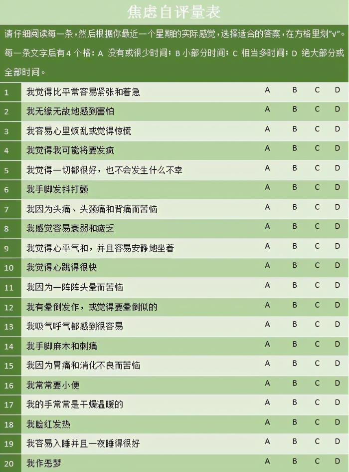 评价:分界值为50分,其中50-59分为轻度焦虑,60-69分为中度焦虑,70分以上为重度焦虑。