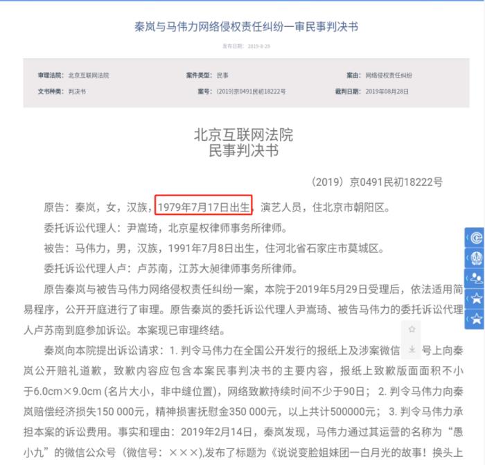 8月29日,法院判决秦岚胜诉,被告须在涉案微信公众号显著位置持续登载致歉声明三十日向秦岚赔礼道歉,并依法赔偿秦岚精神损害抚慰金及诉讼合理支出共计六万元。赢了官司本来是好事,不料法院的判决书无意中暴露出秦岚的真实年龄:1979年7月17日出生,今年应该40岁了。