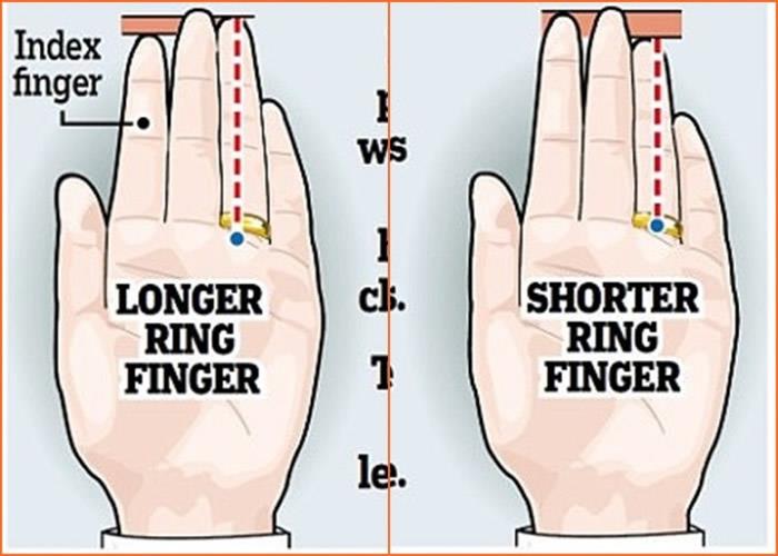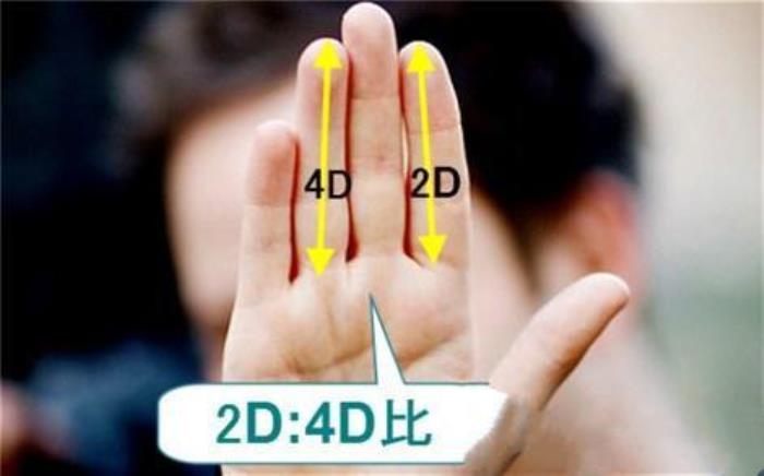 人们的食指和无名指的长度比例被称为“2D:4D”,也就是说,当我们的这两根手指是同样长度时,其比值为1,而食指比无名指长的时候,其比值则大于1、