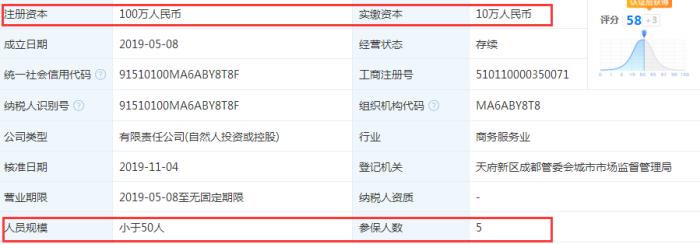 天眼查显示,这家公司注册资本为100万人民币,实缴资本仅为10万人民币。人员规模小于50人,只有5人参保,这和官网介绍的多位牛叉的专家团队形成了鲜明对比。