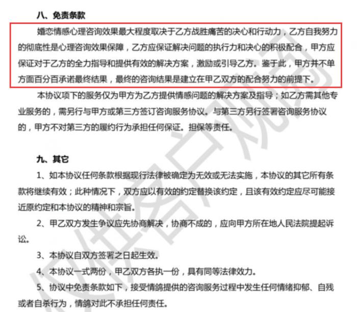 记者在合同上看到,合同约定非法定因素不得任意解除或终止协议。而且,记者在免责条款看到有这么一句:心理咨询效果最大程度取决于乙方(客户)战胜痛苦的决心和行动力……