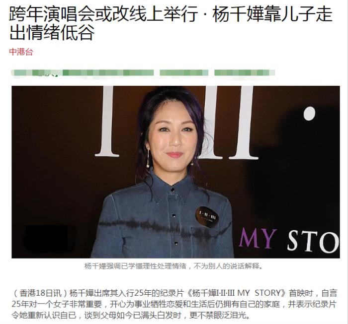 杨千嬅入行25年的纪录片《杨千嬅 I.II.III MY STORY》在前一日上线首映。在首映会上,有媒体向她提及近日网上关于她某平台上的粉丝量不如旧爱郑中基多,她表示毫不知情,并霸气回怼道:“还可以这样计算?我只想在平台说话,做自己想做的事”。