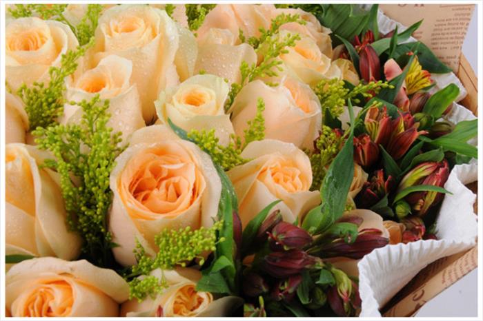 香槟玫瑰:香槟玫瑰饱含着一句特别浪漫的话语“爱上你是我今生最大的幸福”!颜色上也会显得更加沉稳优雅,如果是送妻子的话,那么这款可以作为首选!