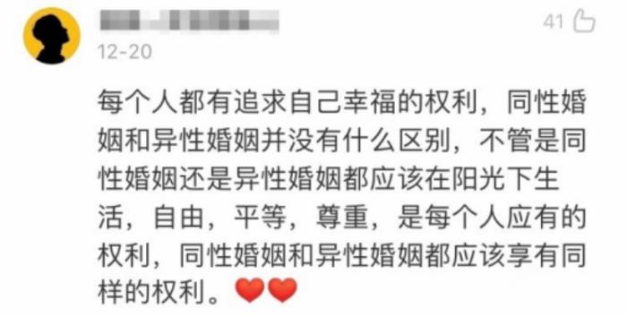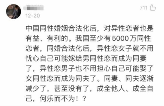 有网友甚至曝出,18年9月,民法典草编案第二次审议案里“同性婚姻合法”的修改意见中,还夹杂了“代孕合法”以及“降低女性结婚年龄到18岁”两点意见。