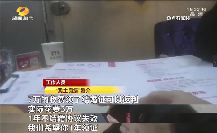 眼看记者质疑婚介价格高昂时,对方表示还有返利婚介消费,记者购买七万的婚介套餐,如果一年内结婚,可以返还百分之六十的婚介费用。