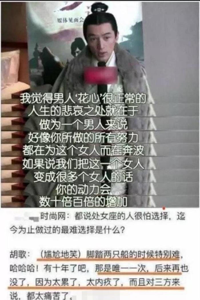 2月10日,有网友晒出截图,发现了胡歌早年与媒体交流过程中无意间表露过自己的感情观念,并且胡歌成就耿直表示过:“男人花心很正常”。