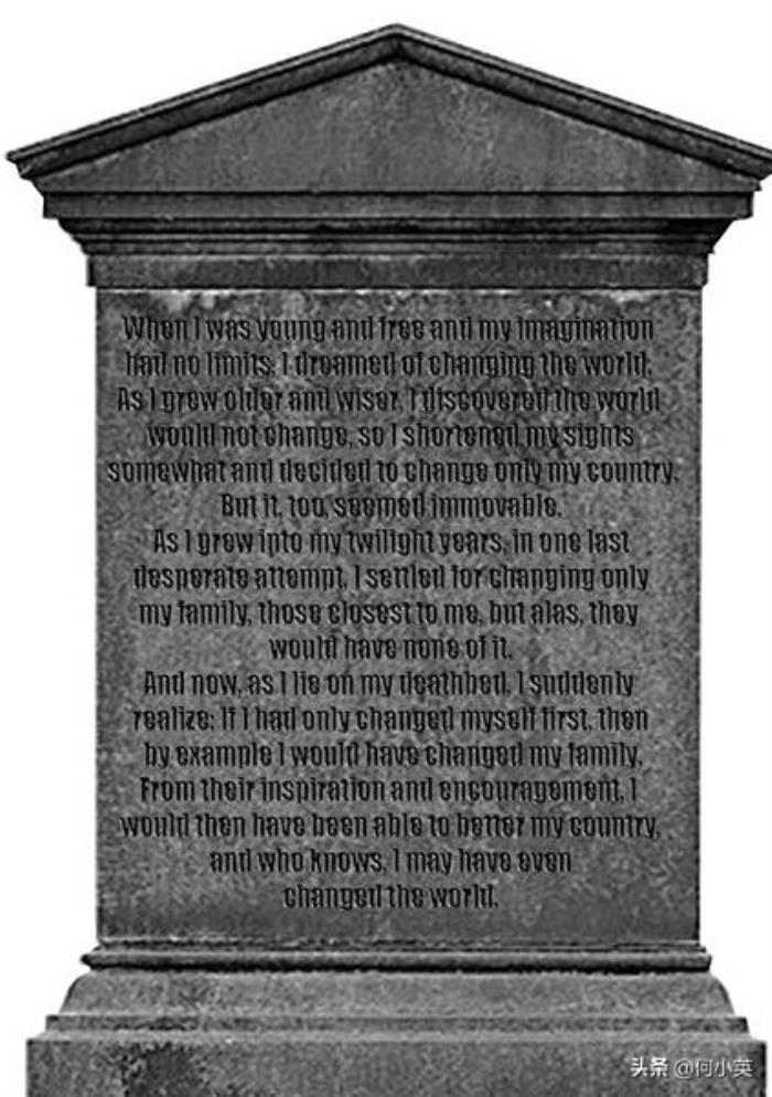 “在我年轻的时候我曾梦想改变这个世界,可当我成熟之后,我发现,我不能够改变这个世界;于是我将目光缩短一些,那就只改变我的国家吧,可当我到了暮年的时候,我发现我根本没有能力改变我的国家;于是我最后的愿望仅仅是改变我的家庭。可是,这也是不可能的。当我躺在床上,行将就木的时候,我忽然意识到,我当初要是先从改变自己开始,也许我就能改变我的家庭;在家人的鼓励和帮助下,也许我就能为我的国家做点事情;然后谁知道呢?说不定我能改变这个世界。所以,其实对们每个人来说,最重要的是,学习如何改变自己。”