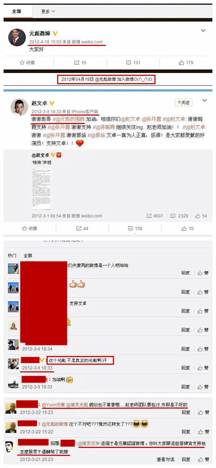 元彪的微博是2012年4月18日才建立的,赵文卓转发元彪的微博,却是2012年3月9日。元彪的微博名字是“元彪微博”,并不是“元彪围脖”。当场就有网友嘲笑赵老师的“作假”团队不靠谱,要检讨,要弄也要弄得真一点。有了这样的操作,赵后面说的话,可信度就不高了。