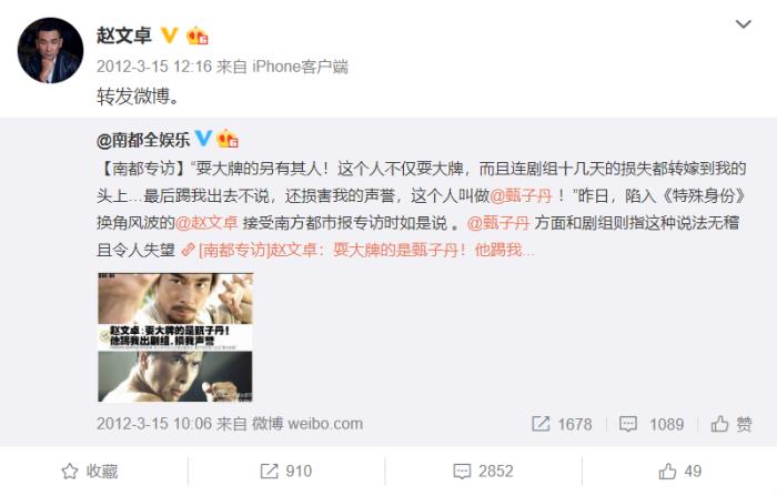 原本在1月19日,《特殊身份》已经在京开拍了。但是在2月28日,就有港媒报道赵文卓在拍摄期间不好相处,耍大牌,并导致该片停拍,第二天就发布上面的声明,结束合作关系。但赵文卓是不是耍大牌呢?他肯定是不会承认的,因此也发声明说,媒体报道不属实,造谣。这期间并未提及甄子丹。