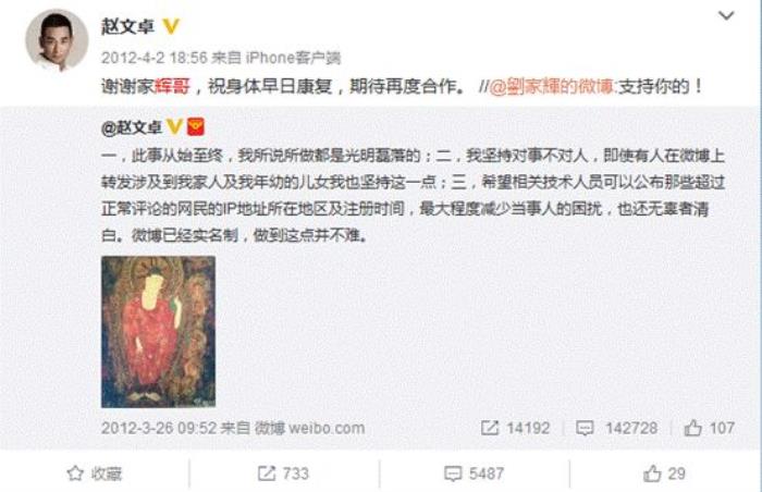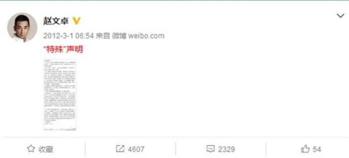 3月4日 赵文卓召开新闻发布会,同一天赵文卓开始在微博拉声援、转发微博,其中包括其妻子、大武当剧组、林丹、洪天明、毛宁等,但是陈奕迅等并未对此事表达任何观点。