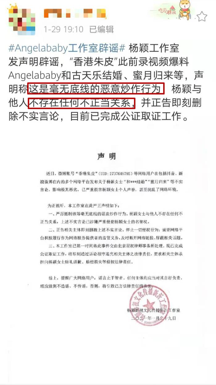 果然,消息传开后没多久,Angelababy方就火速出面发声明辟谣,指责对方是毫无底线的恶意炒作,称杨颖与他人不存在任何不正当关系。朱皮的账号上也迅速删除了这段视频。