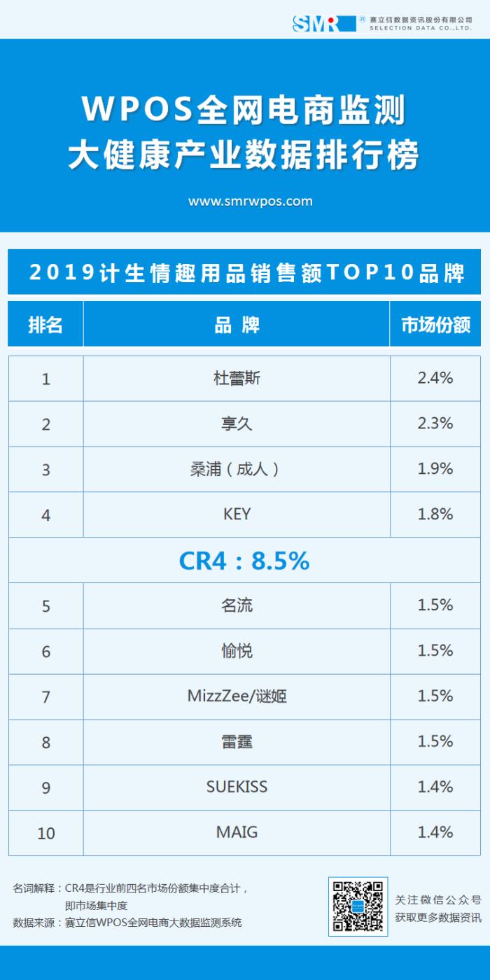 根据『赛立信WPOS全网电商大数据·大健康产业』显示,2019年的计生情趣用品电商领域,品牌集中度仅为8.5%。从数据上看,该市场集中度与成熟度相对较低,目前暂未形成强势/垄断品牌。