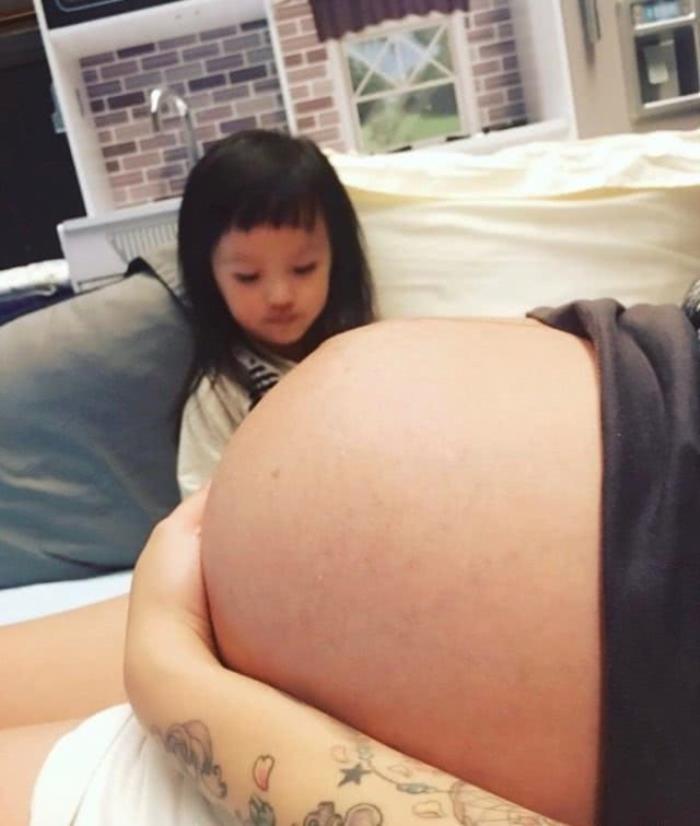 在旁边,大女儿JoJo正在给肚子里的弟弟(妹妹)放歌听,Jojo已经留起了长发,显得乖巧而可爱。