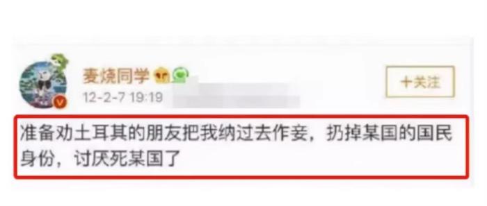 按照以上分析,弦子对朱军的指控是缺乏有力证据的,后来此案也搁置了。没想到4年之后,网名“麦烧同学”的一位微博大V在网上爆料并推动朱军性侵弦子的新闻铺天盖地展开。现在存疑之处是,这位“麦烧同学”身份和过往不简单,她不仅为“境外组织”工作,拥有大量粉丝,而且经常在微博发布不当“恨国”言论,直言想去土耳其作妾也要“扔掉某国国民身份”,还为涉嫌危害中国国家安全罪的康明凯喊冤……