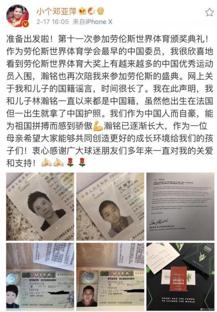 不单是明星会面对国籍的质疑,运动员也会面对关于国籍的问题,乒乓球运动员邓亚萍就曾多次被质疑是法国国籍。面对质疑,邓亚萍晒出自己和儿子的护照,护照上白纸黑字写着两人的国籍都是中国籍,让谣言不攻自破。