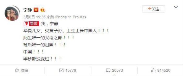 而最近受到国籍争议的明星不止蒋雯丽一个人,宁静也被网友质疑是美国籍。面对网友的质疑,宁静霸气发文表示自己是华夏儿女、炎黄子孙、土生土长的中国人!一直是中国籍,半秒都没有变过!