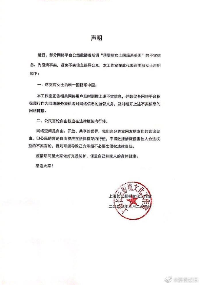 近日,蒋雯丽工作室发布了一则声明,表明蒋雯丽的唯一国籍系中国,澄清了网上谣传她国籍系美国的不实传闻。