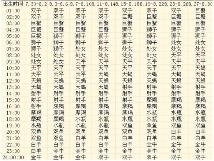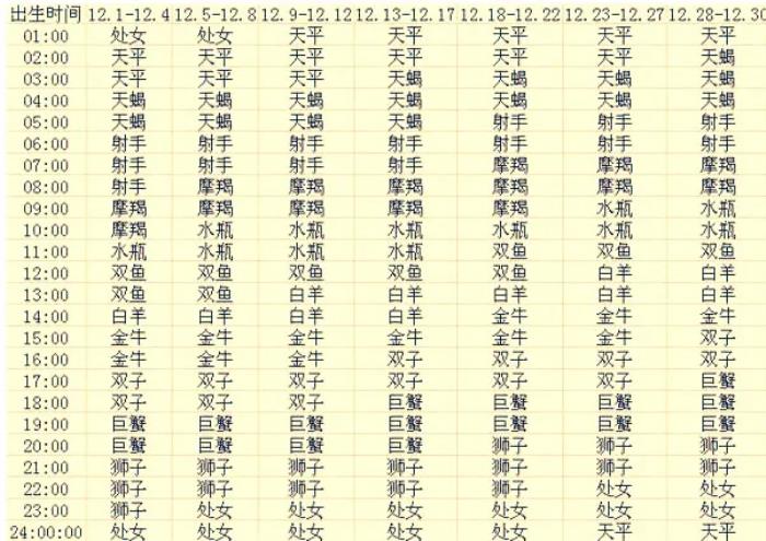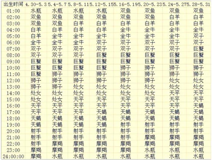 在下表中,找到你的出生时间和日期,对应的那个星座,就是你的上升星座了