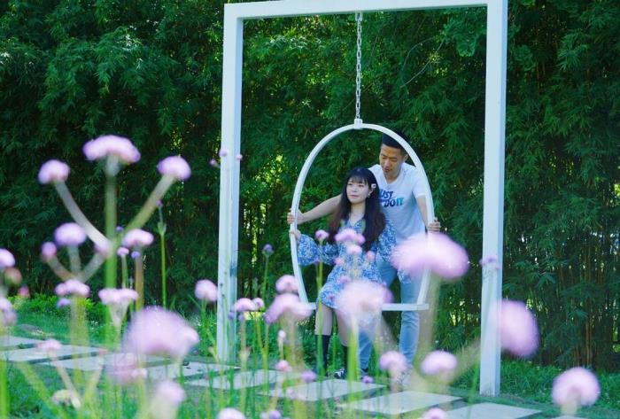 马卡龙色彩的绣球花海、点缀在花海中的恋爱音符、“神仙姐姐”标配秋千、拍照神器“鸟笼”和“相框”……进入绣球花公园,处处都散发着梦幻的气息,尽显浪漫气质,仿佛跌入了爱丽丝梦境。