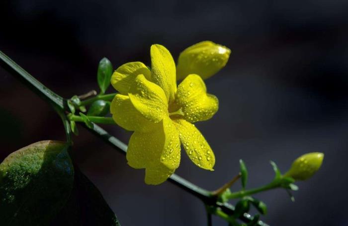 迎春花,别名迎春、黄素馨、金腰带,花先于叶开放,有清香,金黄色,外染红晕。迎春花与梅花、水仙和山茶花统称为“雪中四友”,因其在百花之中开花最早,花后即迎来百花齐放的春天而得名。
