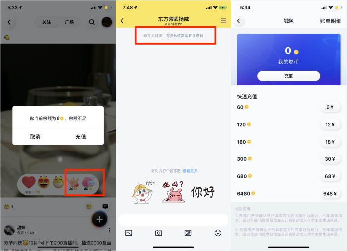 但在关注及广场信息流页面并未选择“上滑下滑”的短视频消费方式,“关注”Tab蓝色标识非常显眼,与关注并列的功能列表里第一个功能是“私信”。私信功能又出现了一个新的付费点,“非互关好友每条私信需要消耗3燃料。”