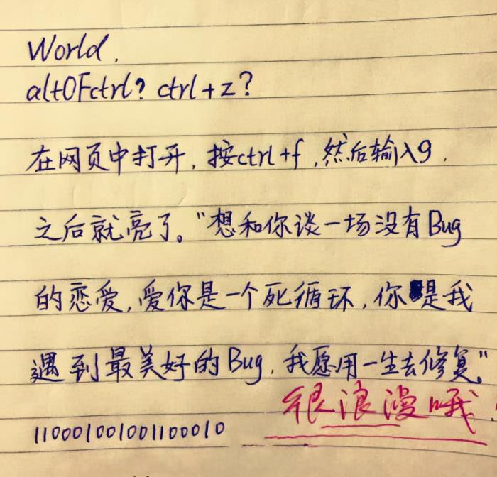 看看这位学霸的情书,莫名其妙的键位组合、“1”和“0”的二进制搭配,令人眼花缭乱,不过翻译成中文还是难看懂,女朋友就是“bug”!