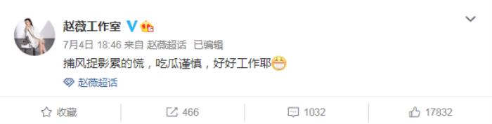 这次传出婚变讨论热度同样居高不下,赵薇和黄有龙均没有发声回应,最后,赵薇工作室发声澄清了此事,工作室表示:“捕风捉影累的慌,吃瓜谨慎,好好工作耶”,否认赵薇和黄有龙离婚。