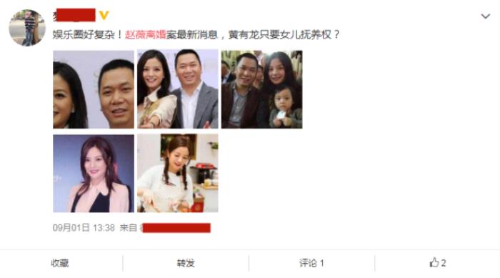 9月1日,也有网友发微博爆料赵薇、黄有龙离婚,黄有龙只要女儿的抚养权。