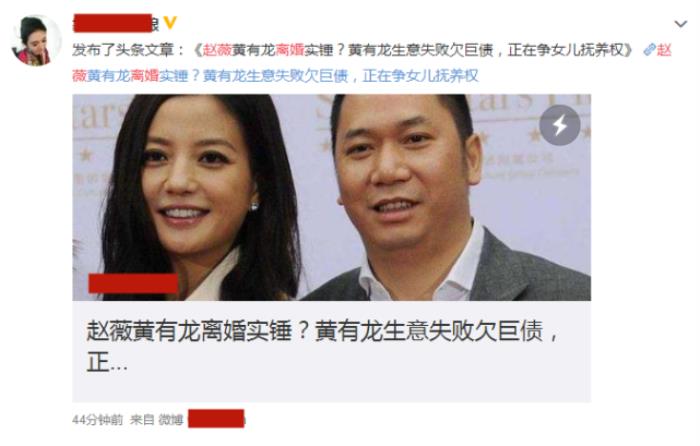 9月3日,有网友在网上发布文章称赵薇老公黄有龙生意失败欠下巨债,和赵薇离婚,目前正在争夺女儿的抚养权。