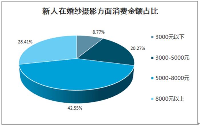 调查显示,有42.55%的新人在婚纱摄影方面的消费在5000-8000元之间,有28.41%的新人达到8000元以上。