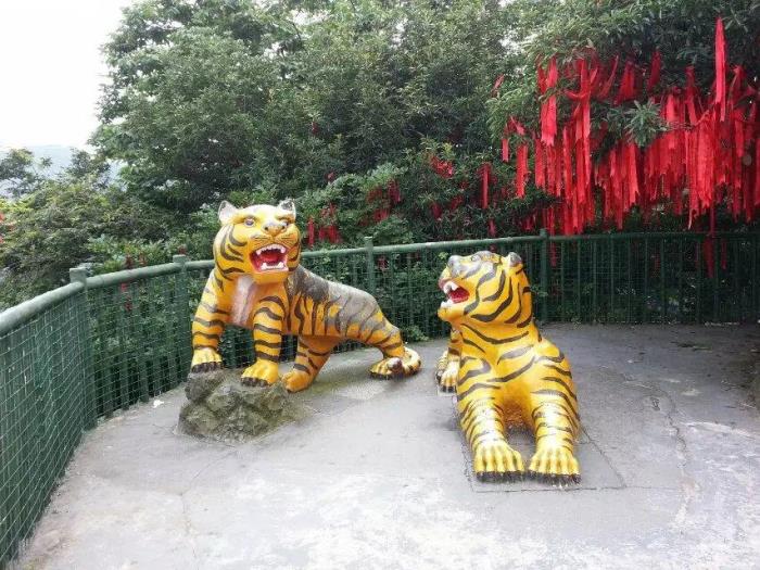 墓碑下面刻有一只老虎,头的朝向就是虎歇坪。从阳台往上走,是一段30米的台阶,台阶两边绿树环绕,树木中间时不时会出现一些竖立着做成老虎形状的木牌,上面雕刻毛主席说过的名言警句,仿佛在警醒着来此处祭拜的世人