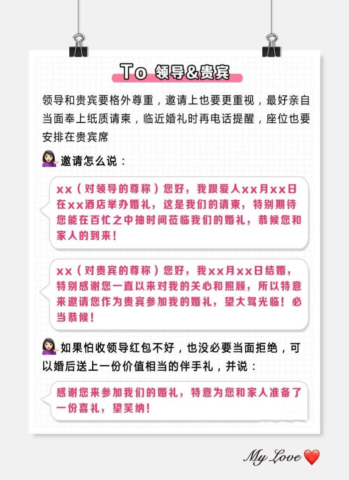 ➂邀请了领导的话,结婚当天一定要顾及到,新人当天很忙,可以嘱咐家里的人帮忙关注下
