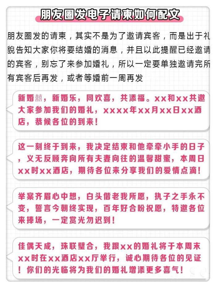 (2)xxx,我要结婚了,第一时间来跟你分享喜悦哈哈!同时诚邀你xx月xx日来xx酒店参加我跟xx的婚礼,期待得到你的祝福和见证!