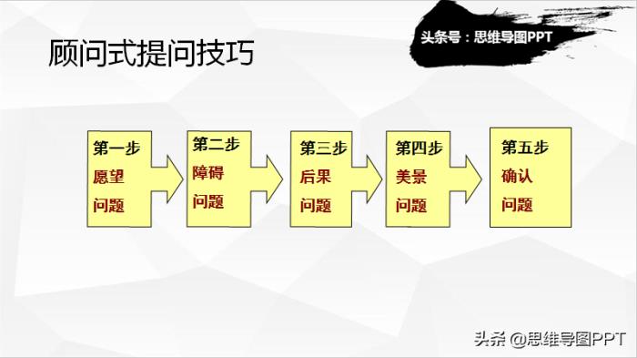 顾问式提问技巧包含5个步骤,通过递进式的提问客户5个方面的问题来达到我们的目的:
