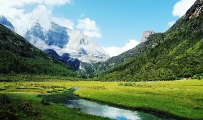 夏天的稻城亚丁,沿途的草原上,星星点点的野花正在怒放,青青的草原、绿绿的草甸,雪白的山巅、清澈的河水构成了高原独特的风光。