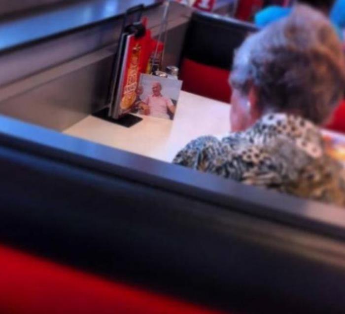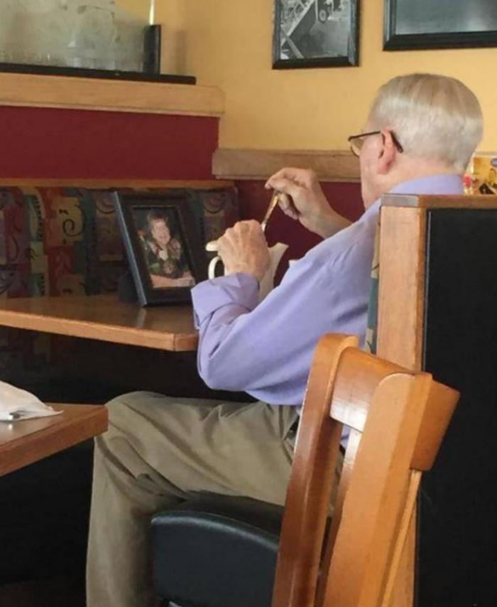 图中在餐厅用餐的网友拍到了这一幕:以为老人在喝咖啡,他并不孤独,摆在桌子上的正是他已故老伴儿的照片。