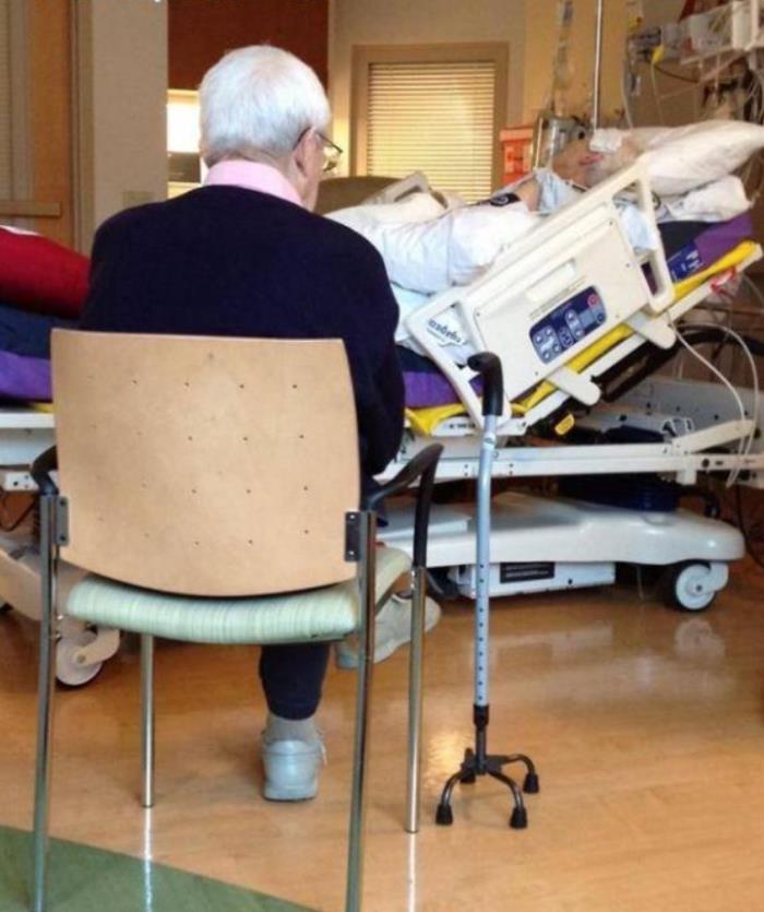 图中奶奶做完心脏手术,90岁高龄的爷爷就这样一直坐在她身边,已经陪了4天,陪伴是最好的爱!