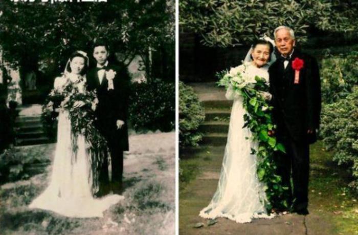 图中这对老夫妇在结婚70年后又一次还原了当年的结婚照,还是那么的般配。