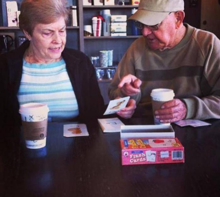 图中这对老夫妇正在星巴克里研究英文字母。老爷爷说他的老伴儿失忆了,所以他正在重新教老伴儿读写。