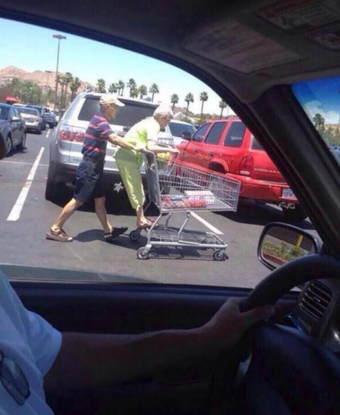 图中爷爷奶奶告诉我一个道理,那就是永远要保持顽皮的心,尤其是在恋人面前!他每次去超市买东西,她都和小女生一样站在购物车上。