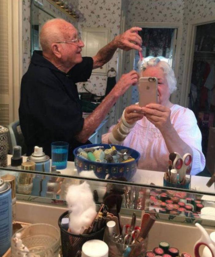 图中奶奶的手腕刚做过手术,像梳头这样的事情,当然就由爷爷接手了。看!他们乐此不疲呢。