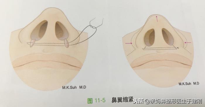 鼻翼折迭,在不切除鼻翼和鼻基底的情况下,切开鼻槛,通过缝合达到缩小鼻翼宽度的方法,该手术简单,无瘢痕,缺点是效果持续时间短。