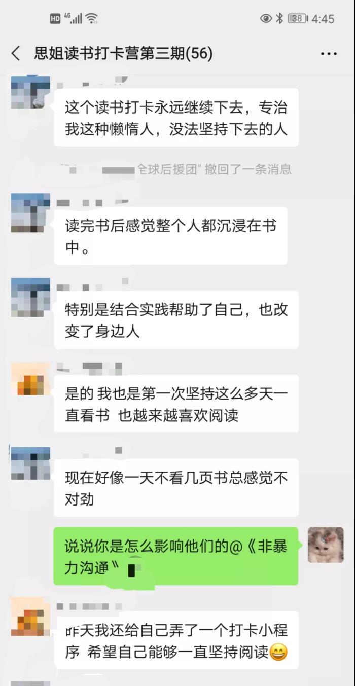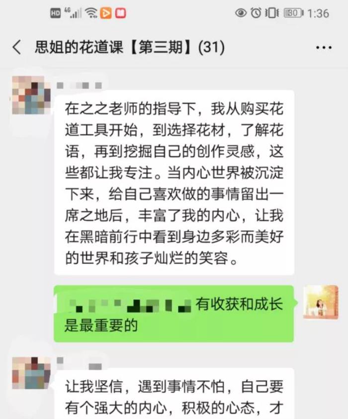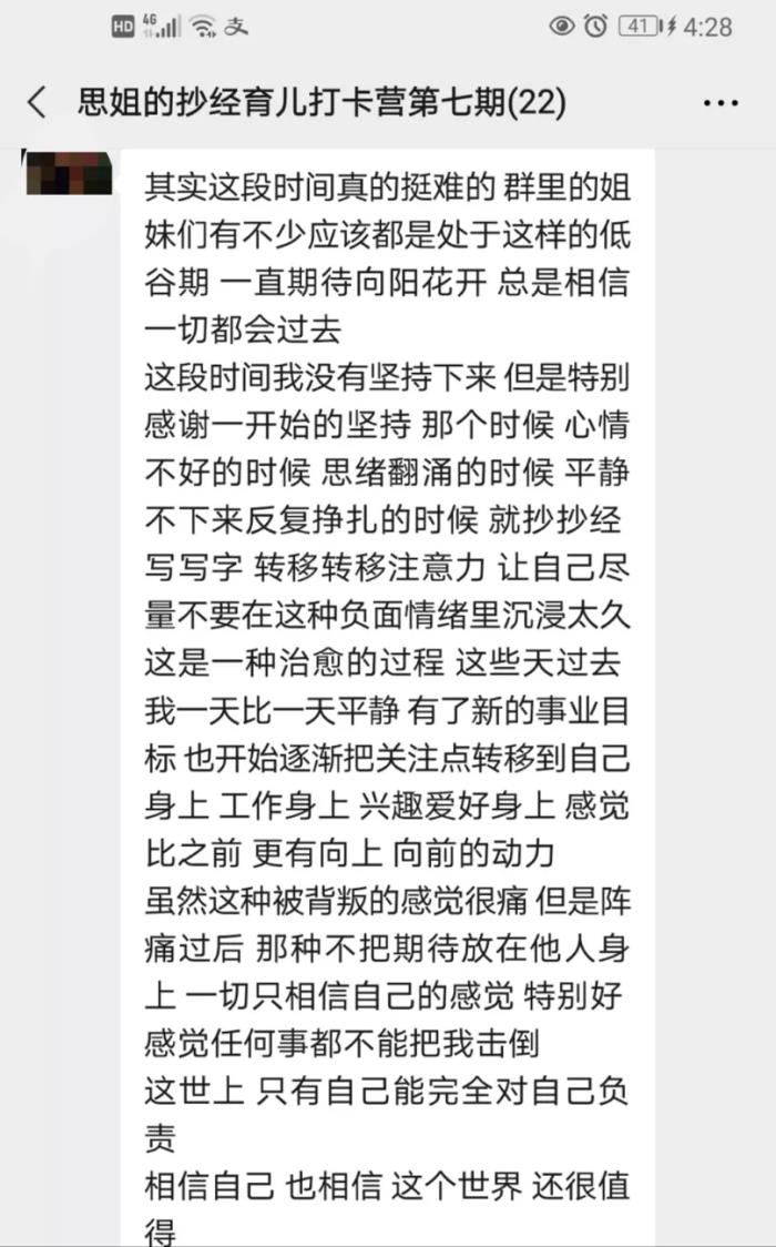 思姐的群里,建立的很多21天训练营,有有读书、有静心抄写群、花道营,都是为了让大家能够在有人监督的情况下,转移自己的注意力,用一点点的成就感,来战胜大家内心的失败感,从而让大家不知不觉中,走上了向上攀爬的道路。