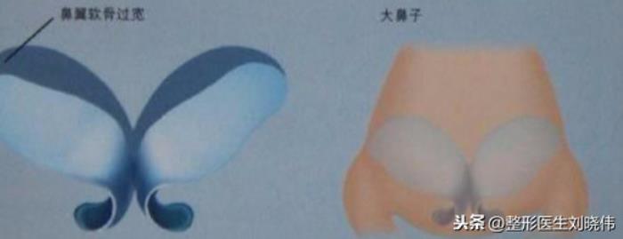 鼻翼软骨发育的过于宽大,通常是大鼻头的重要原因,常见的一般是鼻翼软骨外侧脚过宽的问题。