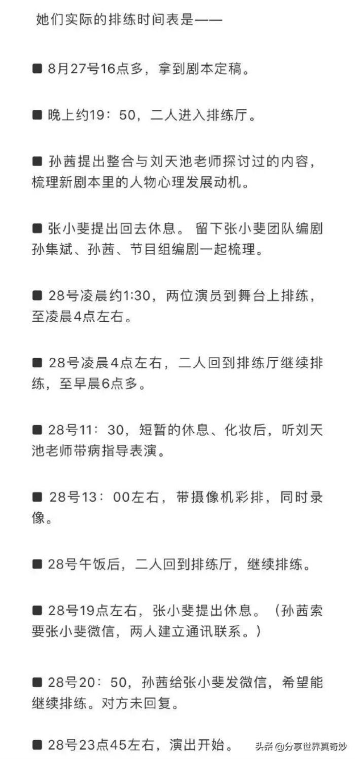 后来孙茜还列出了两人的排练时间线,表示之所以演出效果不好其实是因为张小斐那边不配合——
