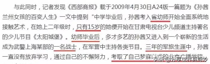 在这篇采访里,她说自己15岁的时候在念幼师,幼师毕业后才去当兵。如果孙茜真的是86年出生的,那她15岁的时候就是2001年,与之前说的2000年就退伍的言论也对不上——