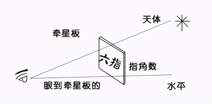 原理:牵星术的工具叫牵星板, 用优质的乌木制成。一共十二块正方形木板,最大的一块每边长约二十四厘米,以下每块递减二厘米,最小的一块每边长约二厘米。另有用象牙制成一小方块,四角缺刻,缺刻四边的长度分别是上面所举最小一块边长的四分之一、二分之一、四分之三和八分之一。比如用牵星板观测北极星,左手拿木板一端的中心,手臂伸直,眼看天空,木板的上边缘是北极星,下边缘是水平线,这样就可以测出所在地的北极星距水平的高度。高度高低不同可以用十二块木板和象牙块四缺刻替换调整使用。求得北极星高度后,就可以计算出所在地的地理纬度。
