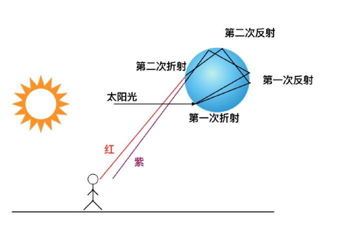 阳光射到水滴里边,经过两次反射,两次折射,共拐了4个弯,多拐了一个弯才出来,就会形成霓。