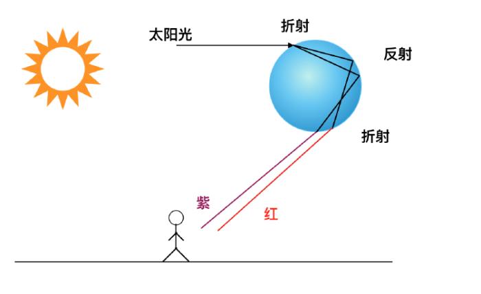 所以不远处的空气里,还会有很多小水滴。阳光穿透这些水滴,在水滴里会发生一次反射,两次折射。就是太阳光在水滴里撞了一下,拐了三个弯。太阳光本来是白色的,在水滴肚子里拐了3个弯之后,被打散变成七色光射到我们的眼睛里,我们就看到彩虹了。